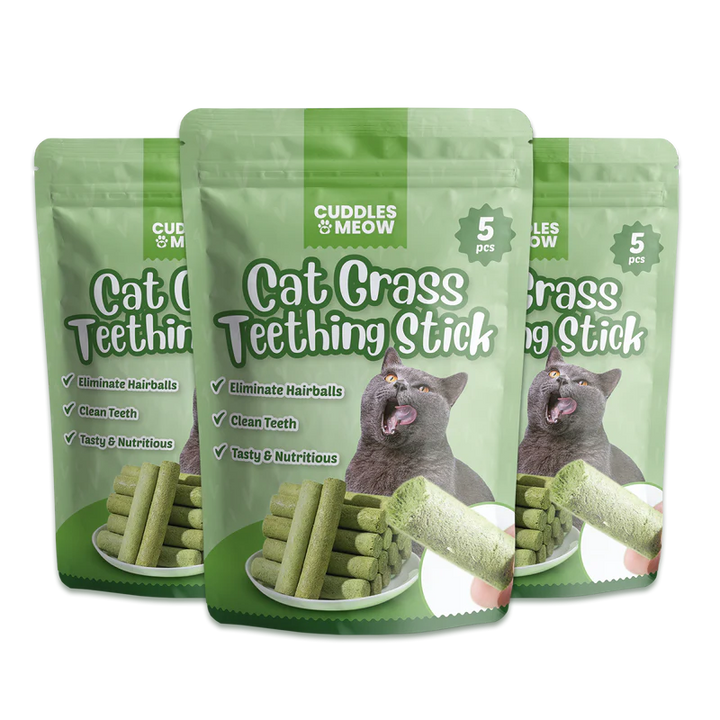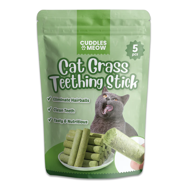 Our Cat Grass Teething Stick will surely wow your cat's paws off with its awesome taste, nutritional value, ability to eliminate hairballs, and did we mention that it keeps their teeth squeaky clean too? All in just one amazing stick!