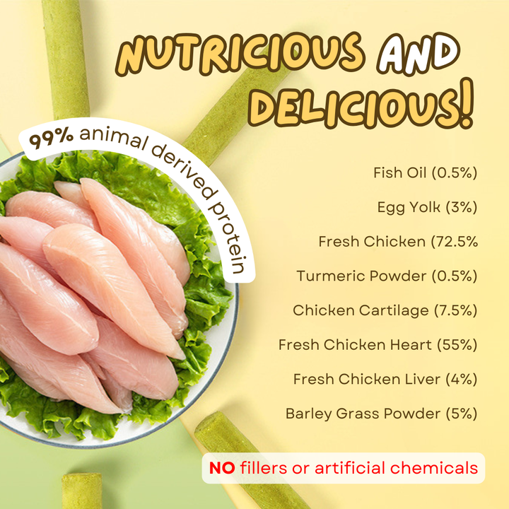 We did not compromise with the ingredients with this one, because we promise that every stick is full of mostly chicken and tons of cat grass with no fillers or artificial chemicals!