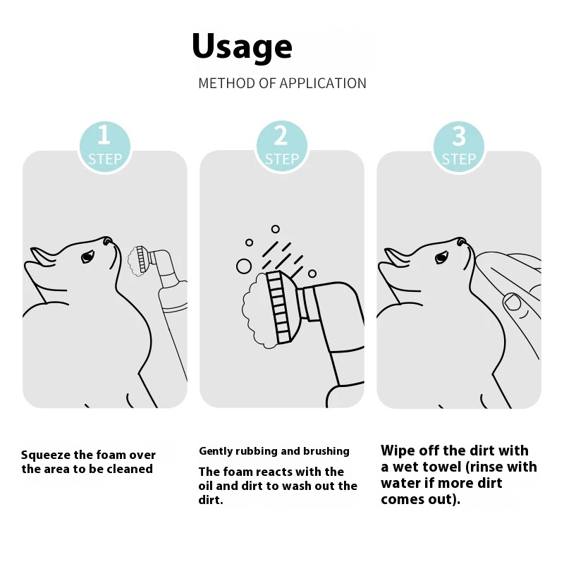 Simply press the pump to release dense foam and use the built-in silicone brush to massage the problem area. In about 30 seconds, oils and grime break down and can be wiped or rinsed away. No need for a full bath—perfect for cats that dislike water!
