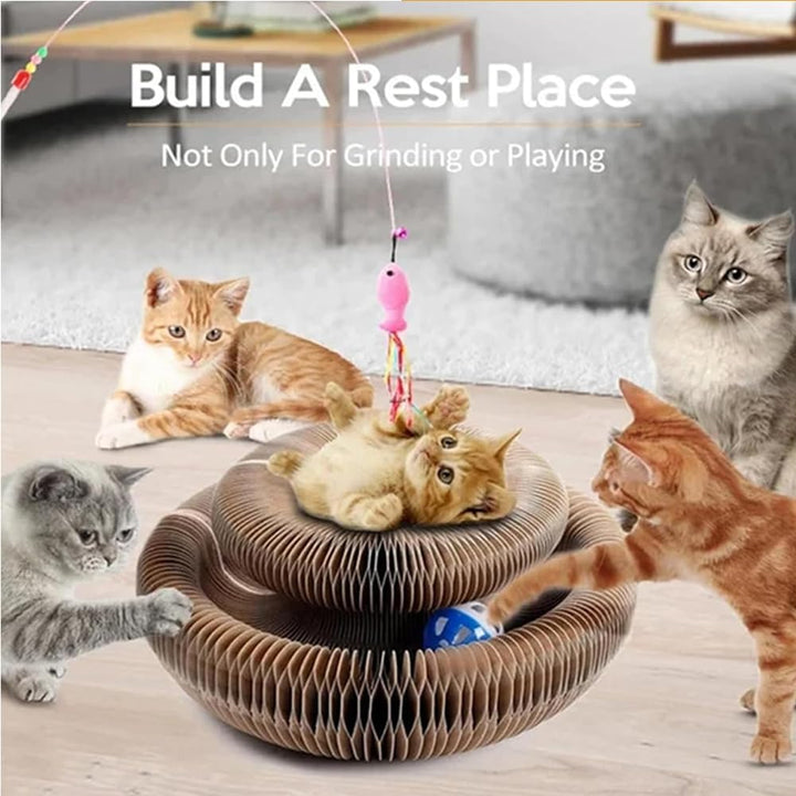 - ăDeformable Designă: Wrap-around track design with the bell-shaped ball, Can be bent and connected into the shape of a circle, can also be disassembled and contracted into the shape of an organ can be folded cat scratcher.