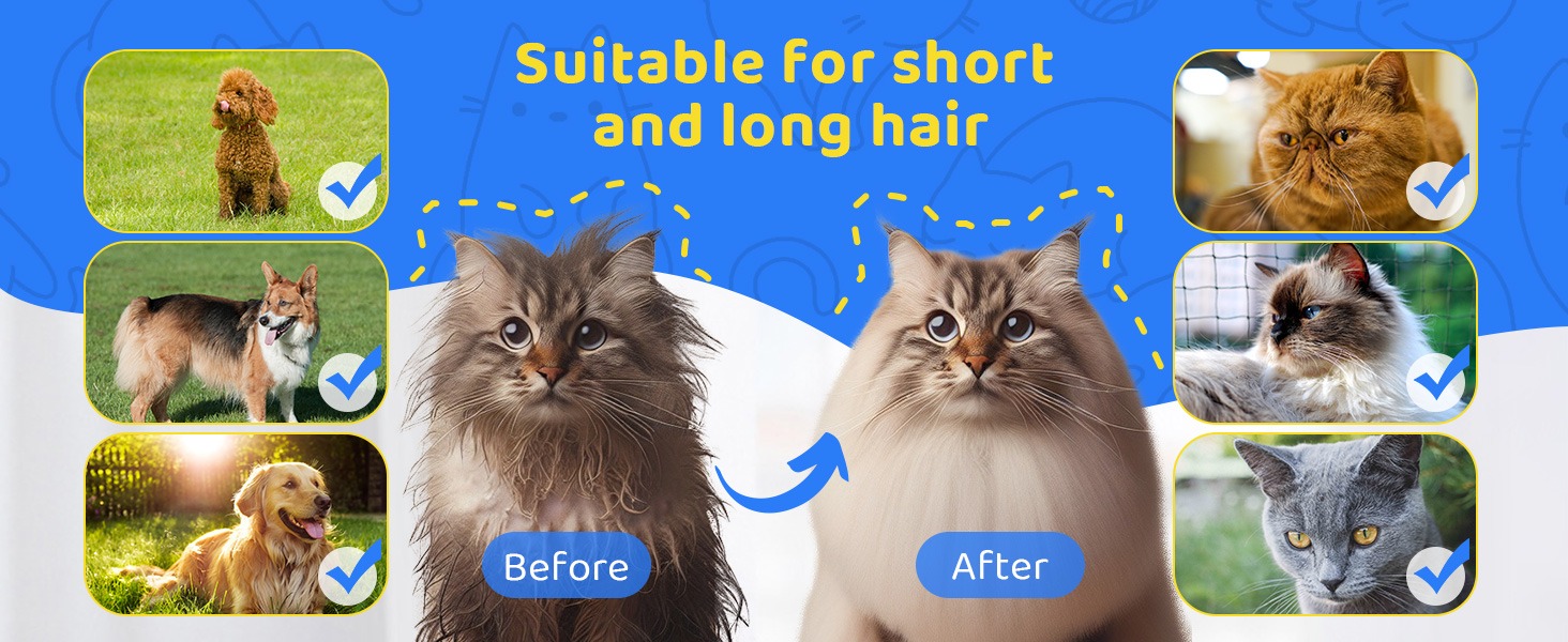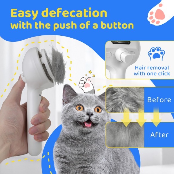 The Cat Brush with release Button makes it very simple to remove all dead hair and dust. During use, you can turn on the spray first and turn it off after 3 to 5 seconds to avoid using the spray for too long and causing the hair to get too wet.